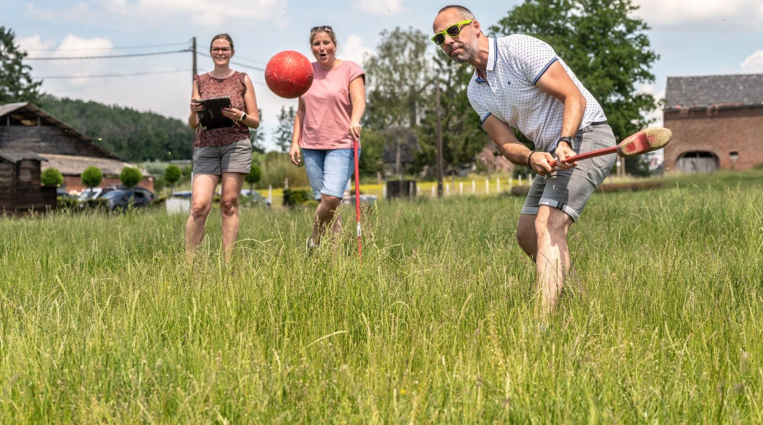 Envie d’une activité légère, mais originale ? Direction la Ferme de la Bourgade à Heure, près de Somme-Leuze, où le golf se joue à la mode fermière. Pas de greens ni de caddies ici, mais une canne en bois avec un sabot au bout et une balle qui ressemble plus à un ballon de foot qu’à une balle de golf. Le parcours traverse champs et prairies, et parfois, quelques vaches curieuses viendront observer — ou bloquer une trouée, juste pour changer d’herbe.