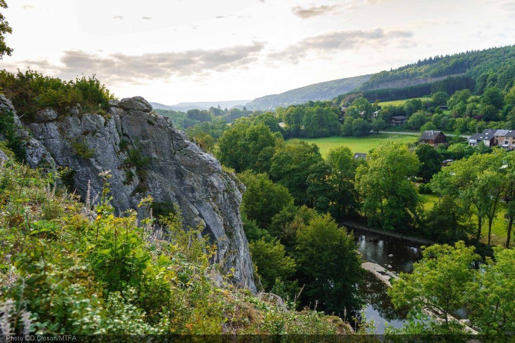 En longeant l’Ourthe, on distingue nettement les strates inclinées du massif, traces visibles d’une histoire géologique longue de plusieurs millions d’années. Au pied des rochers, la rivière s’élargit et forme une zone calme où familles et marcheurs s’installent volontiers. En période de basses eaux, les galets apparaissent par endroits et offrent un terrain agréable pour profiter du bord de l’eau.
