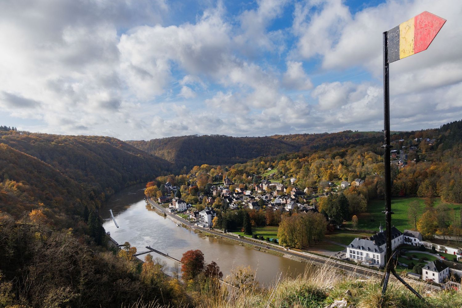 Le départ s’effectue à Anseremme, en bord de Meuse. On emprunte d’abord un chemin longeant la rive droite, au plus près de la rivière. L’ambiance y est paisible, rythmée par les reflets sur l’eau et les premières vues sur le château de Freÿr.