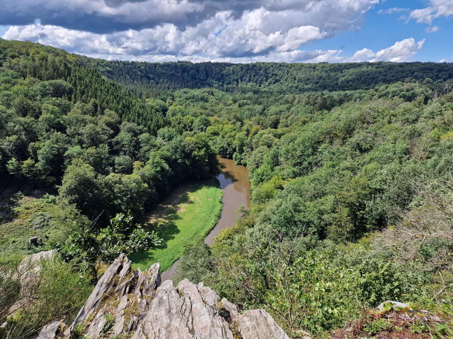 La balade commence dans le village de Chiny, avant de s’élever rapidement en forêt. La première montée conduit directement au Rocher du Hat, l’un des plus beaux points de vue du secteur, avec une vue dégagée sur la Semois.
