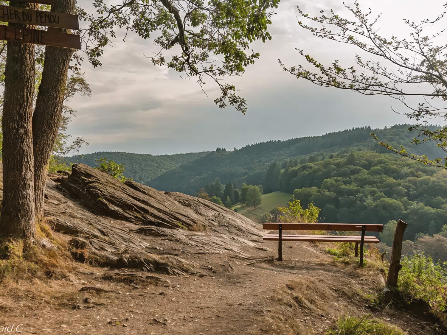 Bovenaan staat een bank waar je kan neerzitten en uitkijken over het landschap: de kronkelende Semois, een abdij wat verderop en de omliggende bossen.